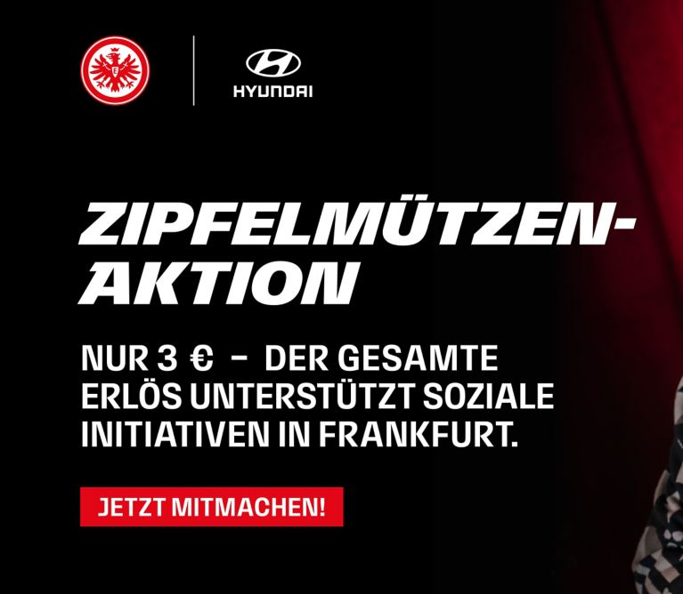 Gemeinsam etwas bewegen, das wollen Eintracht Frankfurt und Hyundai als Mobilitätspartner des Vereins, auch in der Adventszeit: Bei den letzten Heimspielen des Jahres werden exklusiv gestaltete weihnachtliche Zipfelmützen der beiden Partner für drei Euro angeboten – und jeder Euro des Verkaufs fließt in regionale Projekte, die bedürftigen Menschen in und um Frankfurt unmittelbar zugutekommen.