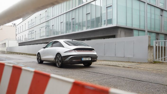 La plataforma E-GMP integra acero de ultra alta resistencia y zonas de absorción de energía estratégicamente situadas para garantizar un comportamiento óptimo en caso de choque. El sistema Multi-Collision Braking (MCB) aplica automáticamente los frenos tras un impacto inicial para reducir el riesgo de colisiones secundarias, mientras que Hill-Start Assist Control (HAC) y eCall emergency assistance proporcionan seguridad adicional en la conducción diaria.