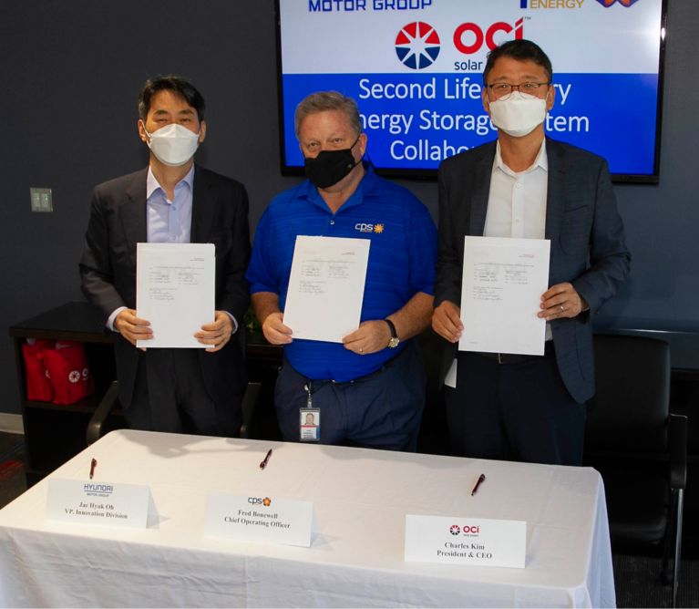 OCI Solar Power, one of the largest utility-scale solar energy developers in Texas, CPS Energy, the nation’s largest municipally-owned, fully-integrated electric and natural gas utility, and the Hyundai Motor Group, a South Korean multinational mobility manufacturer that includes Hyundai Motor Company and Kia Corporation, signed a Memorandum of Understanding (MOU) to test recycled electric vehicle (EV) batteries for solar energy storage.