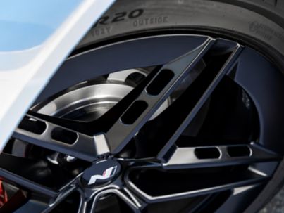 Walking through the café’s car park, leaves scattered underfoot, Harrer pauses to point out the defining details of the IONIQ 6 N: the swan-neck rear wing, the 20-inch alloy wheels with perforated, machined spokes, the subtle depth of the shimmering Performance Blue Pearl paint. Then the conversation widens again.